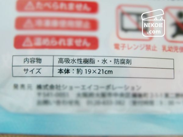 - 内容物には変化なく、高吸水性樹脂・水・防腐剤。