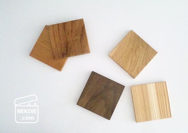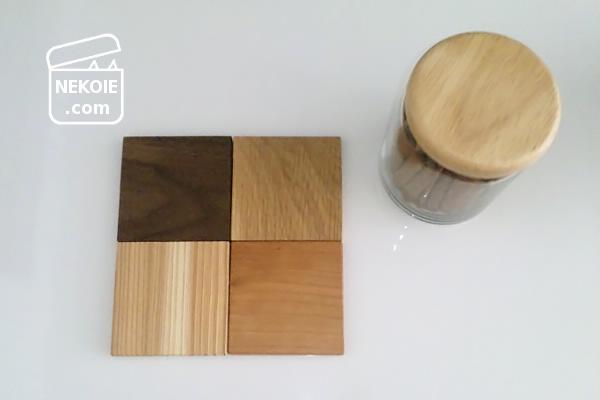 実はこの板は家具の見本板。無料でいただいたもので、もう十分本来の役割は果たしてくれ、いつでも捨てられます。でも無垢板で木目を見ているとホッとします。もしコースターを探しているときにこれと出会っていたら、お金を出してでも買っていたと思えるアイテムで、今も大切に残して、家カフェに活用しています。
