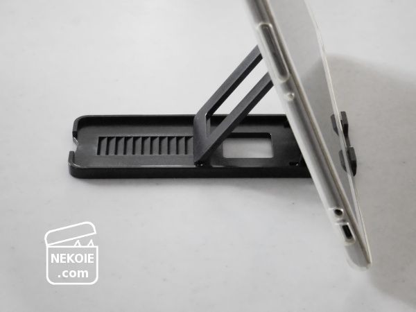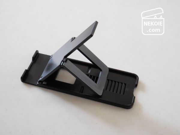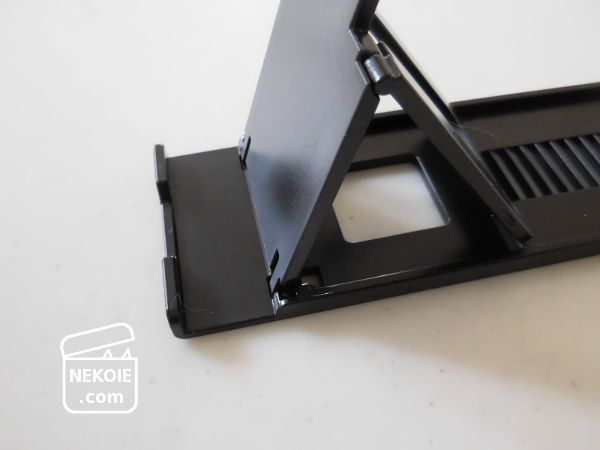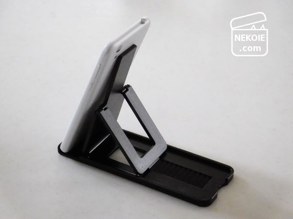 価格的にちょっと不安はありましたが、私が立てるつもりだったのはタブレットより軽量のスマホなので少しは安心かなと。結果は良いほうに裏切られて、10インチのタブレット(こちらは読書用)を立てても簡単には倒れそうにありません。