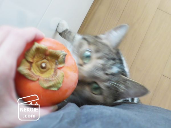 弟猫はいつもおやつを見つける(この日は桃でした)。