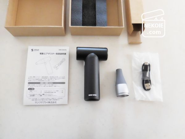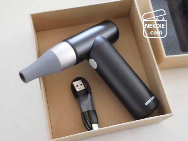掃除機などでもコードレスより給電しながら使うタイプのほうがパワフルという印象があります。ただこれまで当然のようにコードのなかった缶タイプのエアダスターに慣れていたので、今回も充電式を選ぶことに。