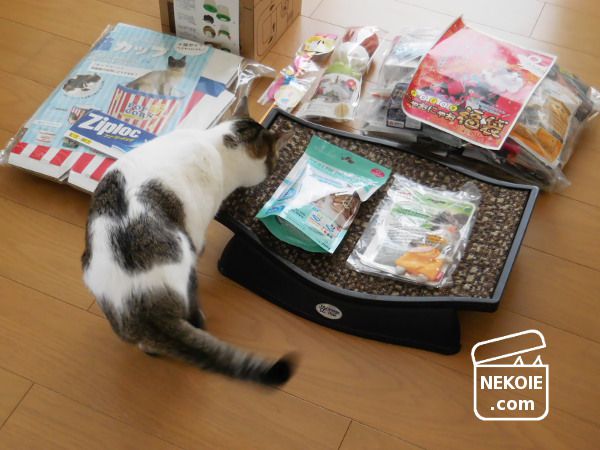 年長組の兄猫たちは、花より団子。雑貨類よりもサンプルフードに興味津々のようでしたが、おそらく猫じゃらしを振ればいっしょに走り回ってくれるはず。フードはおいしく食べつつ、正月太り防止にたくさん遊んでもらおうと思います。