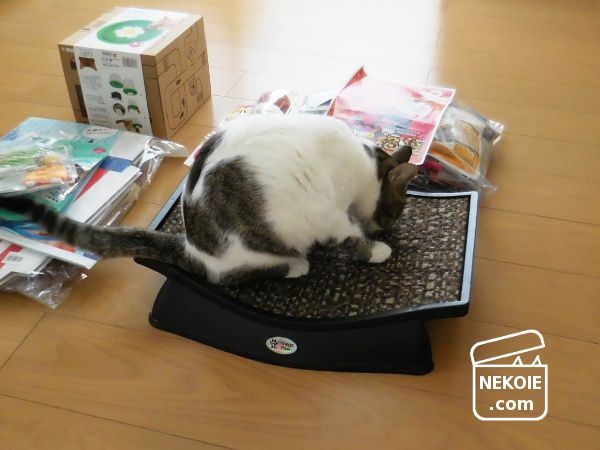 大型の二つはポップコーンカップデザインのダンボールハウスと、ベッドにもなりそうな爪とぎ。