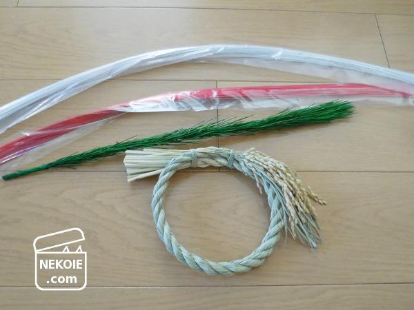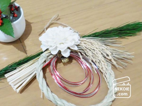 お正月用につくったもの、一部しか記事にしていなかったのですが、今年のしめ縄飾りは土台(200円)だけを購入し、松の飾りはオマケでいただいたものを使用。