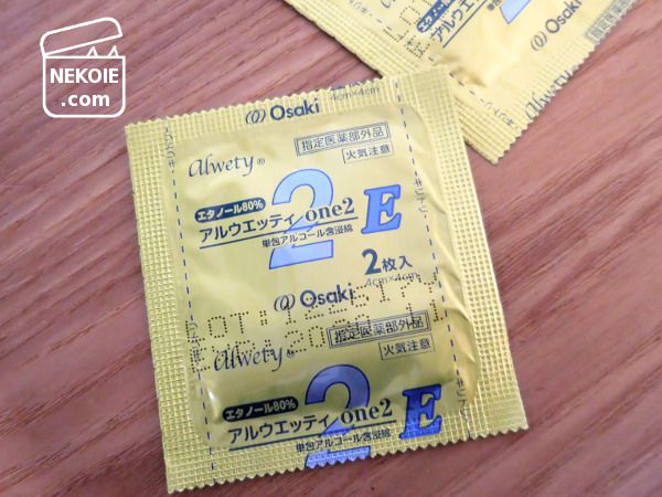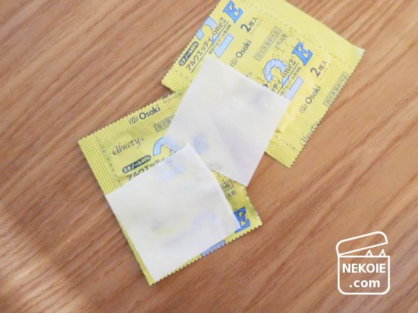 小さなアルミの袋に入っているのは、化粧用コットンよりも一回り小さめ、そして薄手の酒精綿(アルコール綿)二枚。適度にアルコールを含んでいて、小さい除菌用ウェットティッシュのような感覚で使えます。