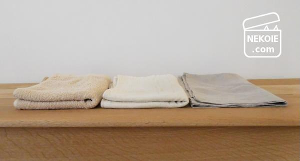 日常用のタオルはフェイスタオルより小さいものだけ。バスタオルは猫用、或いは湯たんぽなどを「包む」用途のみで使っています。