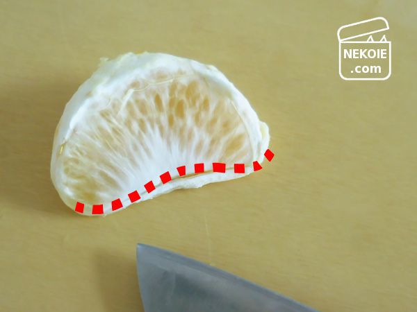これまでの私は、「一部分だけに十字」の切れ込みをいれて、そこから手でこじ開けるようにむいていたのですが、今回は「球体をタテに四等分するイメージ」で、外皮の厚みに包丁の刃を入れました。