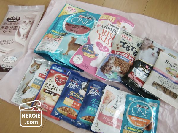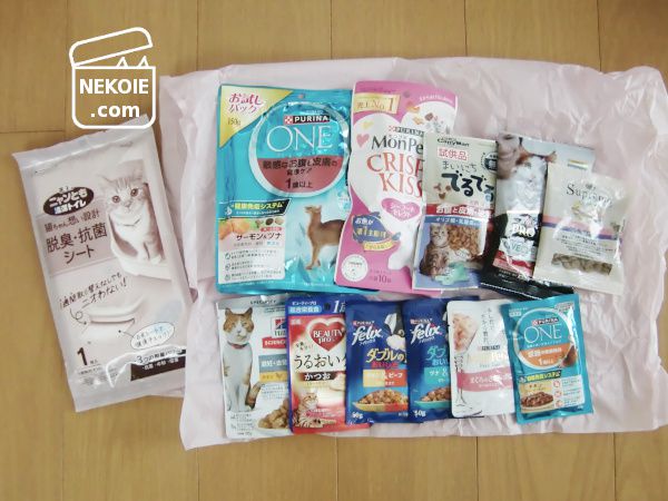 - 内容としては十点ほどのキャットフード(パウチ一点やサンプルサイズのドライフードなど)。