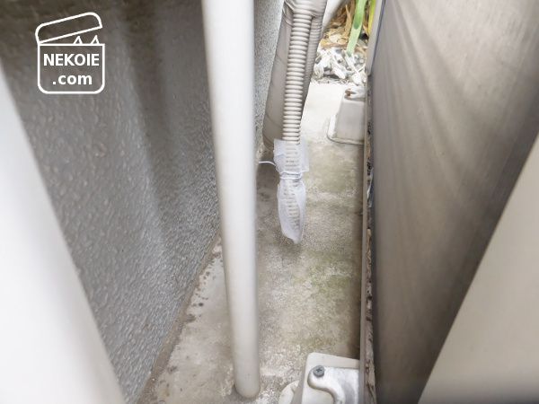 こちらはエアコン室外機の裏側です。室外機本体は地面に固定されているので、すき間しか写せないのですが、この裏側(周辺)に出ているのがドレンホース。エアコン稼働時、内部の水滴を排水するためのホースです。