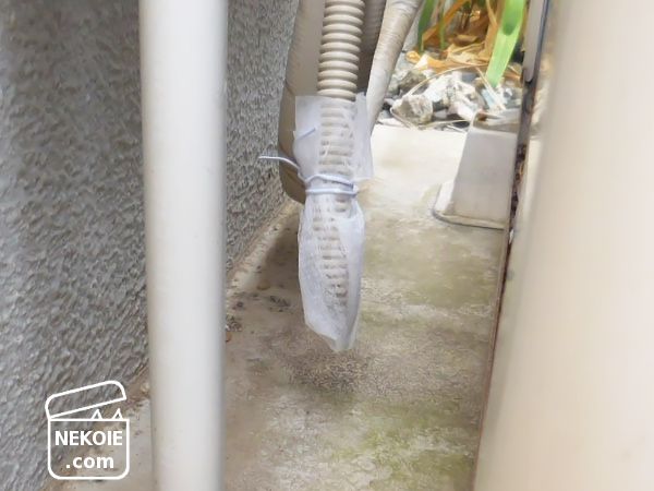 排水口ネット(不織布シートなど)は、大体15cm四方に切って使用。それでドレンホースの先端を包むようにし、新品家電のコードが束ねられていた針金(ビニールタイ)で固定しています。