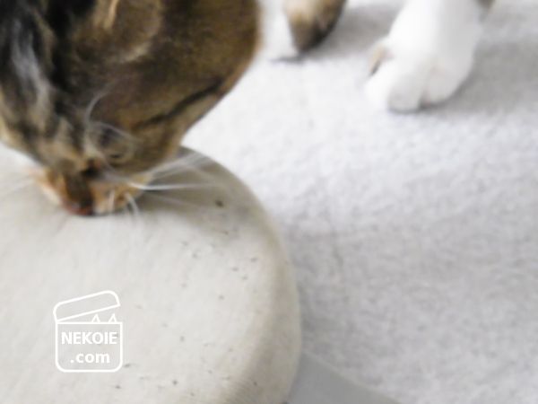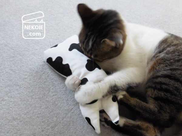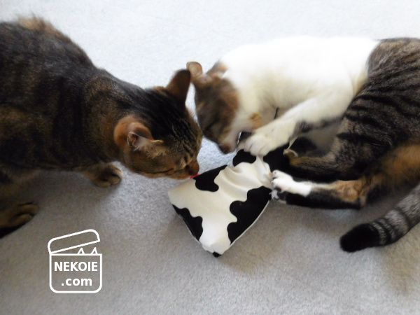 クッションに似たものといえば、蹴りぐるみタイプのものも大人気。ただ猫用に市販されているものは大抵中身がふわふわのわたななので、猫たちにとってウレタン素材のクッションとはまた別モノという位置づけのようでした。