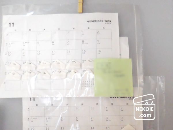 同じく100円ショップでウォールポケットタイプの「おくすりカレンダー」なども売られています。ただ毎回のように迷いつつも、今回は印刷したこちらを使うことに。