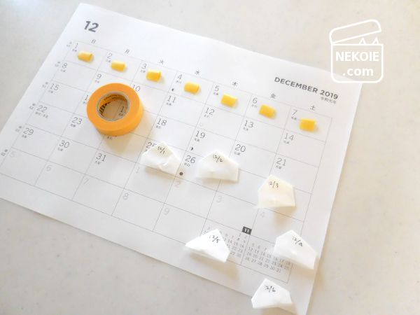 薬が処方されている日に両面テープ(今回はマステを輪にして代用)を貼って、そこに薬包紙をぺたぺたと。