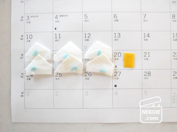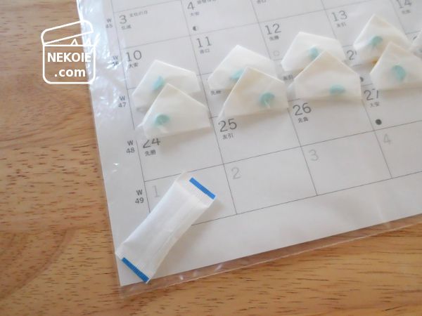 あとは日ごとに当日分をはがしながら、中の錠剤を猫に飲んでもらうだけ。内容的にはあまり楽しいものではありませんが、アドベントカレンダー方式です。