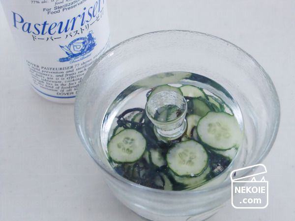 このガラス鉢で浅漬けをつくる際に欠かさないのが、うつわのアルコール消毒。
