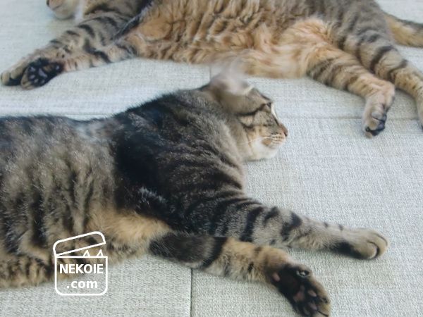 エアコンの利いた部屋で倒れている兄猫たち。広い場所はやや寒いらしくいつもはベッドの中にいて、私がリビングで座りこんだ途端こうして出てきてくれます。