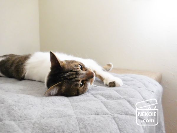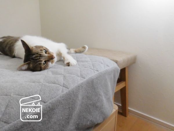 ちゃんと受け身をとっている(?)様子なのであまり心配はしていませんが、こうした家具でちょっとだけすきまを埋めておくのもいいかなと。ベッドの周囲を空けているのにも理由があるので、ひとまずそんな対策になりました。