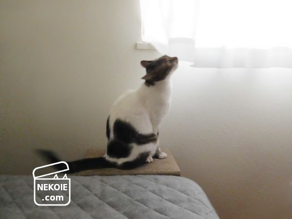 逆に、猫がベッドから更に高い位置へ飛び上がるとき。わが家の寝室に背の高い家具はなく、猫が上がりたがるのは窓枠です。