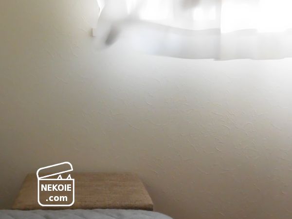 やはりここも壁とベッドが離れ、更にはカーテンが進路妨害。その上、弾力性のあるベッド(マットレスや掛け布団)を足場にするとジャンプにも苦戦する印象だったのですが、壁に寄せたスツールからの移動だとそのハードルがぐっと下がる様子。