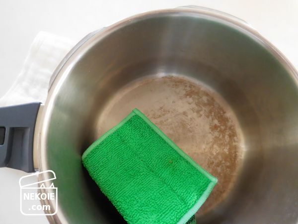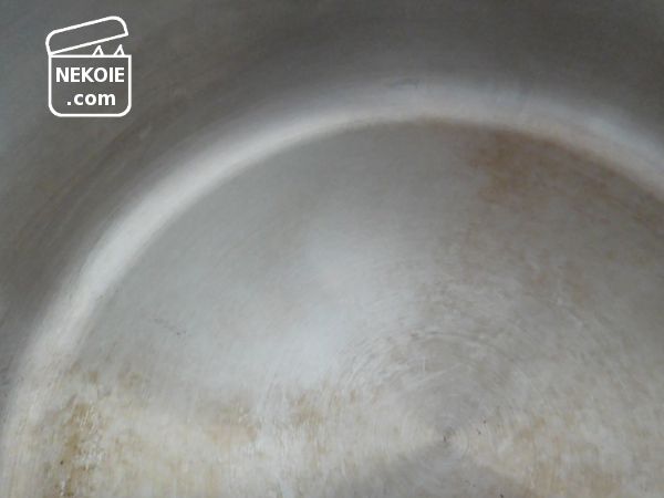 豆を煮た後の鍋底は、いつも汚れ(あく?)がついてしまいます。これはつけ置きなどで落とすこともできるのですが、このときは試しに万能とマイクロファイバークロスでみがいてみました。