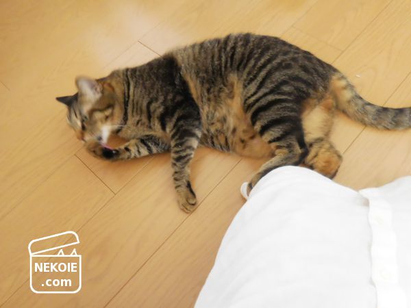 人のひざを蹴っ飛ばしながら、肉球のお手入れをする彼。