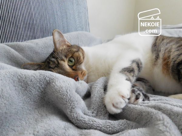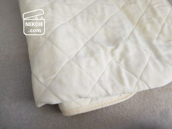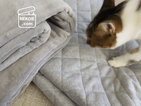 今回の写真を撮影したのは数週間前のことで、このとき猫がふみふみして確認してくれたのは敷物のほうのみでした。毛布(ポリエステル100%)への不安は残ったままだったのですが……