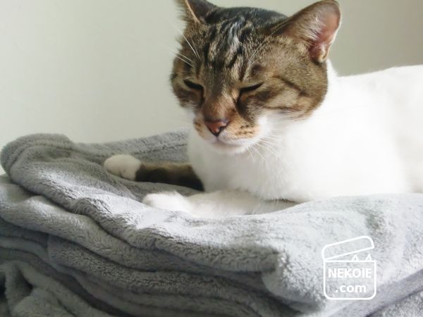 先にも書いたとおり素材に関しては少しこだわりを持って奮発したはずだったのですが、やっぱりポリエステル毛布の上でのびのびしている弟猫を見ると、固執していたのは私だけなのかもと苦笑してしまいます。