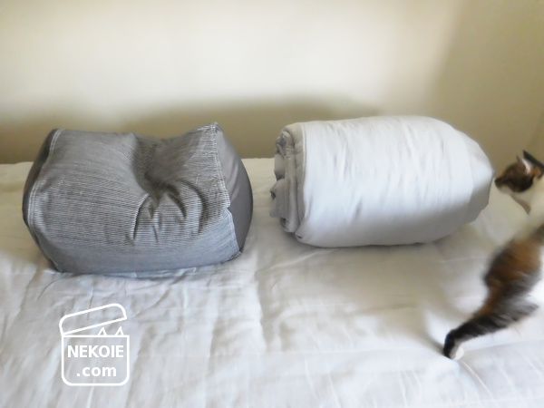 猫たちに使ってもらうつもりだったので反応としては大歓迎。ただもう少し収納しておく予定でもあったため、置き場所に悩みました。夏物を片づけてからでないと定位置をつくれそうにないし、撮影場所は私のベッドの上(シーツなどは洗濯中)なので夜になると邪魔なのです。