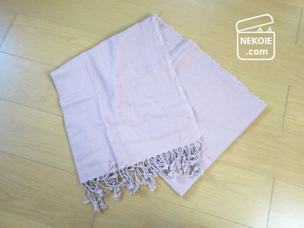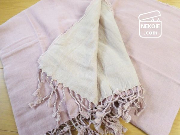 フリンジを除くと178×73cmのサイズで、素材はコットン100%。ガーゼのような柔らかい風合いで、静電気の心配が大きい化繊は避けられたら、という希望でさがしていた私には理想どおりでした。