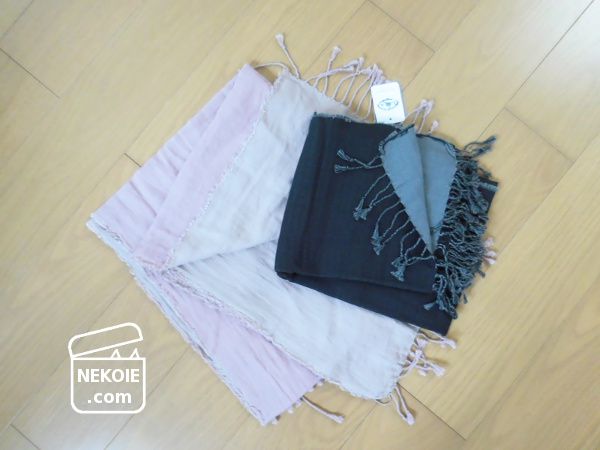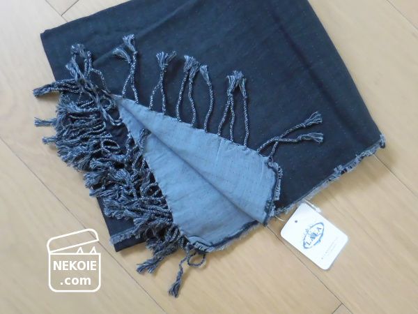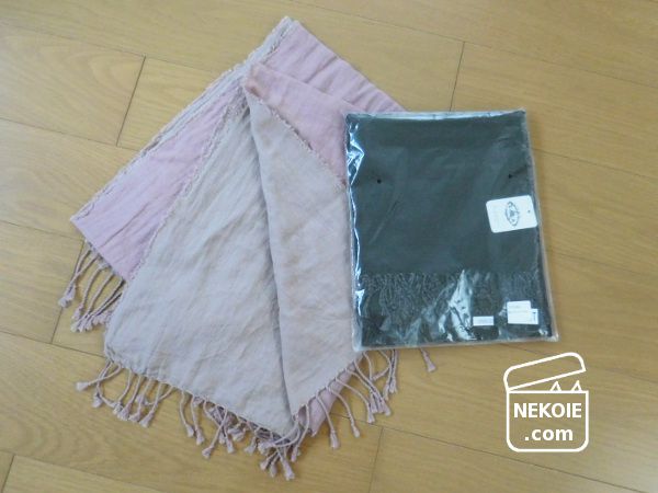家の中で使い始めると、猫がフリンジを口にしないかとか、ガーゼ感のある生地に爪を立てられないかとか、色々心配事も増えるのですが、プチプラなのでそれも許容範囲。むしろ静電気の心配なくみんなで使える素材にしておいて良かった、と思っています。
