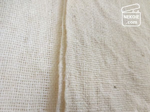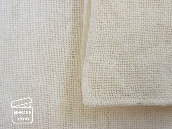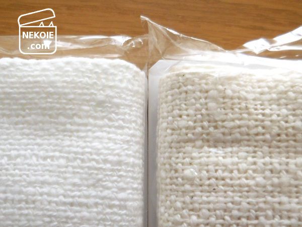 生成りのほうは(並べて見ないとわかりにくい程度に)ややアイボリーがかっていて、私がこれまで愛用してきたびわこふきんの生地。綿花の繊維である黒い点が入ったものです。