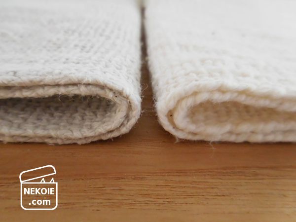 私の言葉で説明するなら…一般的なパイル地タオルのように目が詰まっておらず、パッと見はスケスケのメッシュ生地。それなのに驚くほど吸水性がよく、石けんいらずで食器の油汚れを落としたり、お湯だけ洗顔を可能にしたりと万能なアイテムなのです。