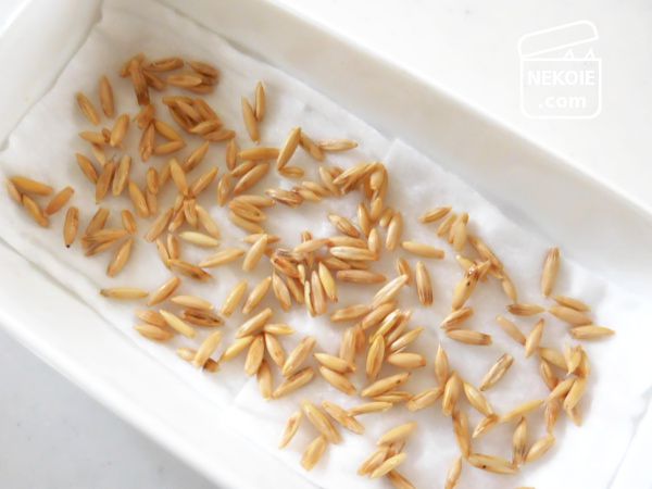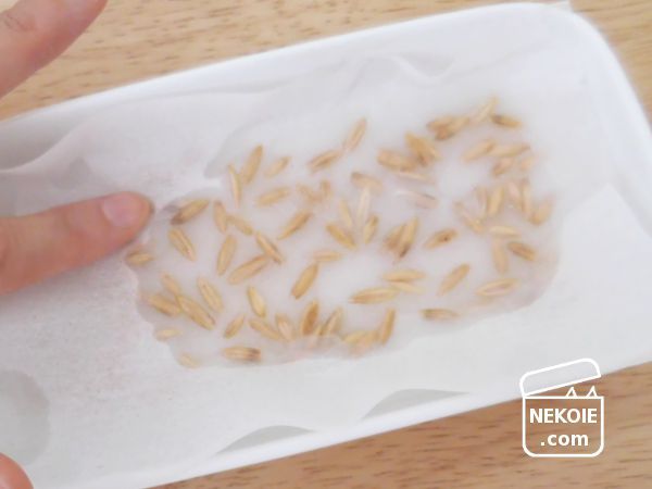 猫草(燕麦)の種はあっというまに発芽するので、途中でコットン交換などを行うことありません。伸びた葉が自力でつき破れるようティッシュを採用しました。