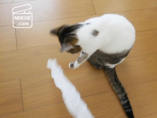 あまり伸縮しないタイプの包帯で、うっかり猫の体に絡んでの事故につながる心配は少ないんじゃないかなと。それでも渡しっぱなしにはしませんが、思わぬ戦利品でした。