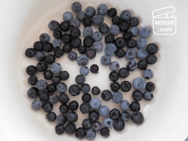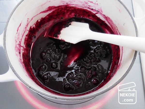 洗ったブルーベリーを直接鍋に入れて、かき混ぜながら弱火にかけ、水分が出たら果実の半量の砂糖(果実100gに対し砂糖50g)を投入。