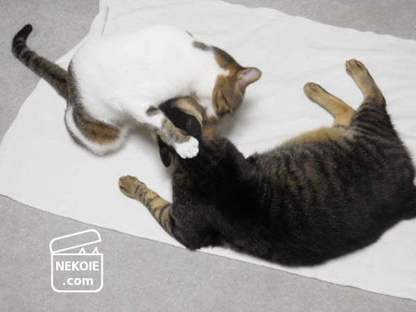 兄猫を毛づくろいしてあげる弟猫は、兄猫の頭を抱えこまずにいられない。兄猫も嫌がるそぶりはないのだけれど、見ている人間としてはもやもやと不安な気持ちになってしまいます。