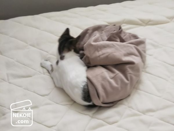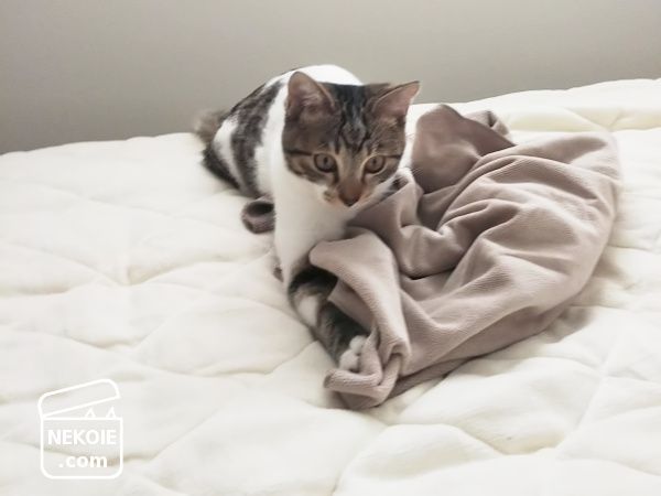 ピンボケでごめんなさい。寝起きの猫をバスタオルで簀巻きにしました。