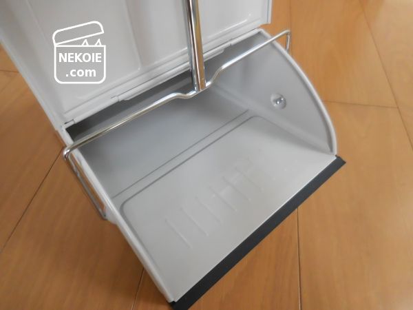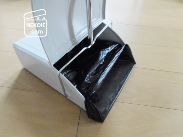 最初は袋をセットする方法(下の写真の状態)も試していたのですが、それだとほうきを使ったとき、細かいほこりなどがちりとりの下に入りこんでしまうようなのであきらめることに。