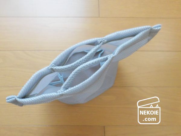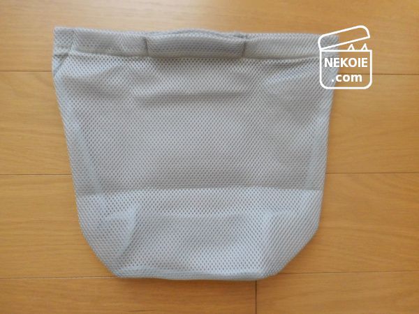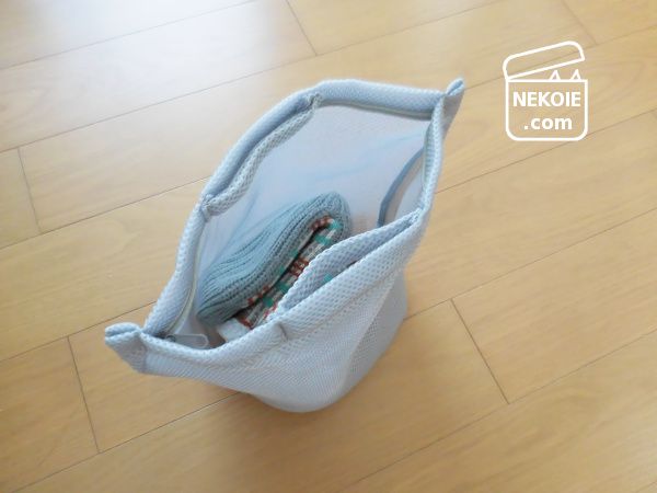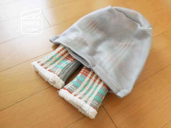 厚手であったかいぶんかさばるし、何よりその辺に放置しておくと弟猫が持って行ってしまう危険性が高い。ただ脱いだ靴下をテーブルの上などの高い場所には置きたくないし、つるしておくにも悩ましい。そこで家の中では専用の布バッグなどに入れて持ち運ぼうと考え始めていたのですが、そんなタイミングで出会ったのが今回の洗濯ネットでした。