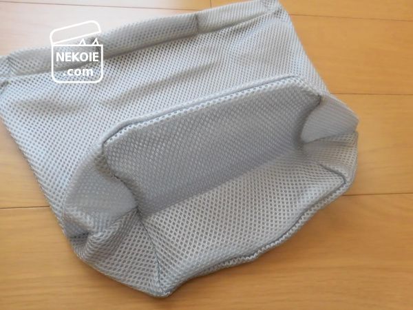 これまで見てきた「バッグ型の洗濯ネット」はその多くが数百円、ものによっては千円以上だったので、100円で買えるとなると強度なども心配でした。前述のとおり、いずれは自立させるのは難しくなりそうな柔らかさと薄さではあるものの、100円ネットの生地としては悪くないかなと。