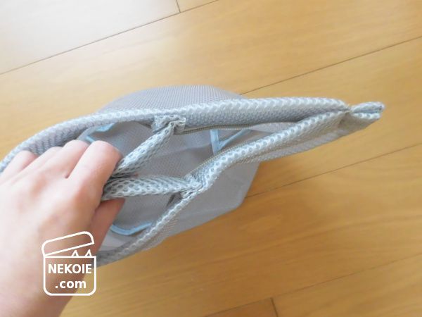 私の場合、このバッグの購入目的に屋外(コインランドリーなど)へと持ち出すことは考えていなかったので、持ち運びの距離はせいぜい家の中だけ。サイドに垂れるような長さの持ち手より、すっと手を入れるだけですむこの形状は望んでいたとおりのものでした。