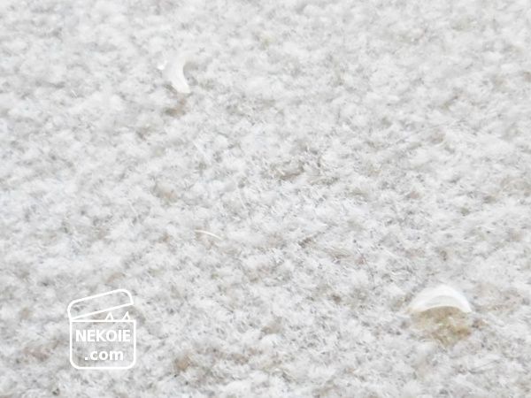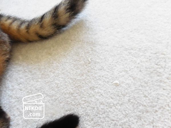 そうしてカーペットタイルの上で爪とぎが行われると、はがれた爪はほとんど動かずにその場所に残ります。