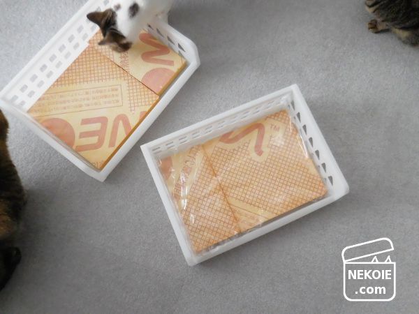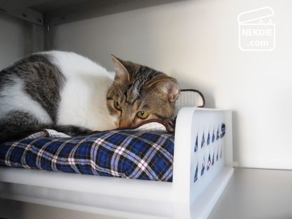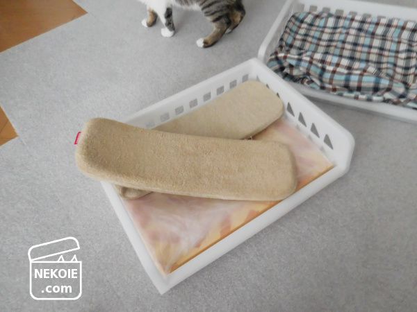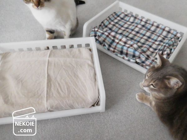 新品で買ったベッドとは違って、不用品を組み合わせてつくった寝床。なじみのあるニオイで猫たちもすぐに順応してくれるかなと。