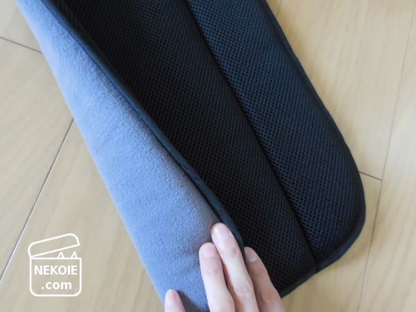 裏表でメッシュとフリースの生地になっているのですが、それ以上に感触が…もちっというか、ぷにっというか、延々と触っていたくなる感触なのです。これなら多少揺れても、猫の身体に負担をかけにくいのではないかと。
