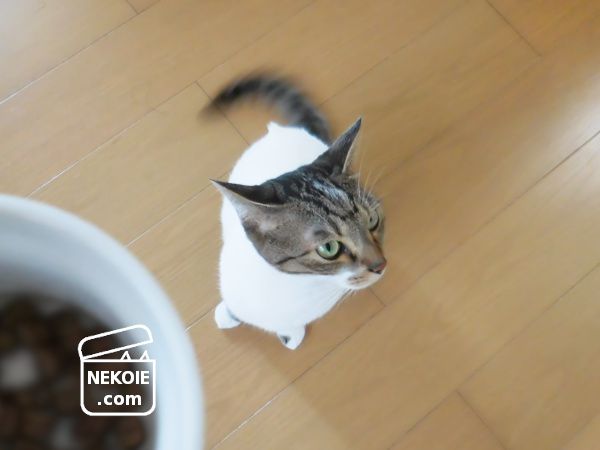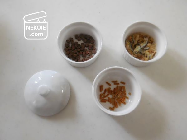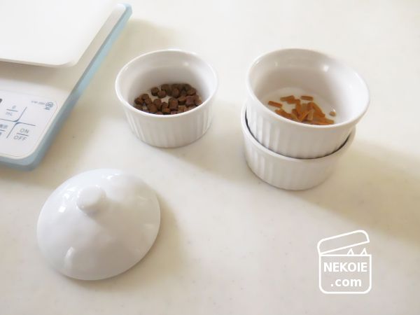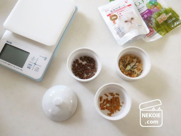 毎回、冷蔵庫から出したおやつをキッチンでそれぞれ計量し、リビングで待つ猫たちの元へと運びます。