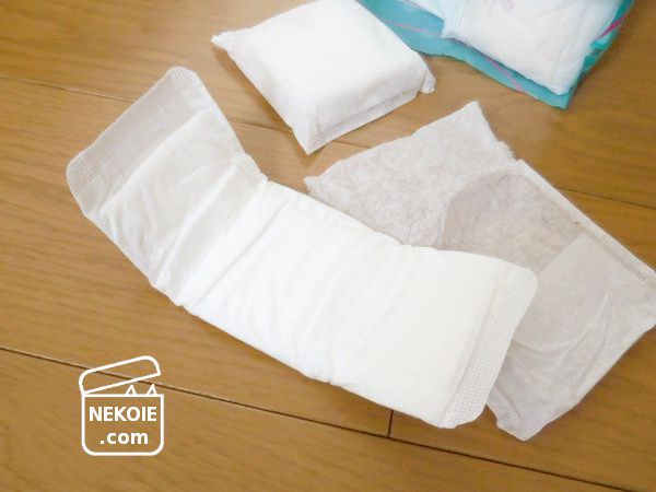 実際の使用感としては、見た目も含めて今どきの女性用ナプキンとはいいがたい部分があります。古き良き、といいたくなるような生理用ナプキン。感触はふかふかしていて薄くはないし、特殊なしくみもありません。大きめの夜用や羽根つきといったシリーズ展開もなし。