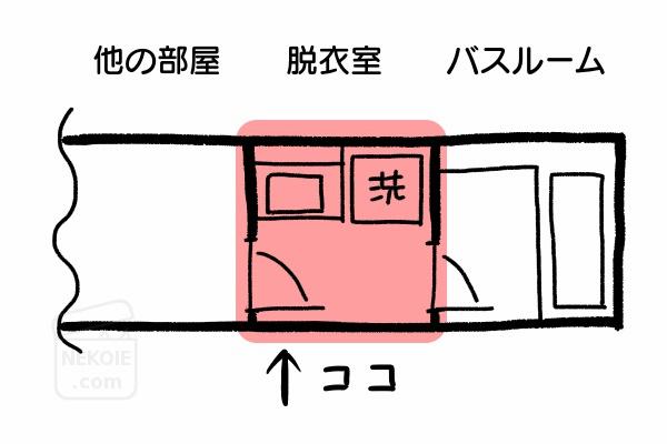 他の部屋とバスルームの間に「脱衣室」(洗濯機スペース・洗面室)がある間取りは、ファミリー向けの物件では多いと思います。わが家もこんな並び。