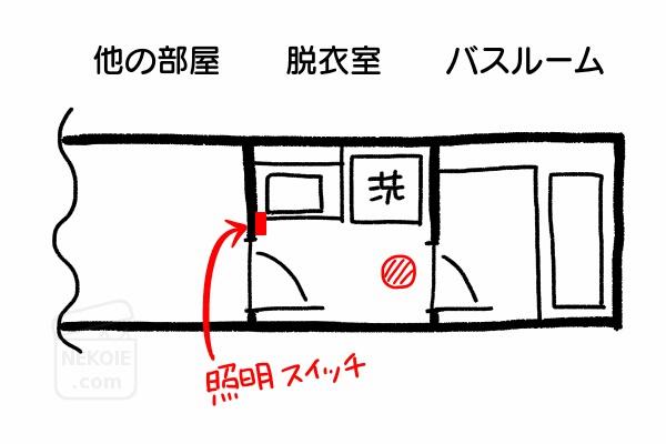 今の家で暮らし始めた当初、照明スイッチがバスルーム側にないことが問題になったのですが(出てすぐに脱衣室の電気をつけられない)、「バスルーム内で身体を拭いてからあがる」という方法でほぼ解決しました。