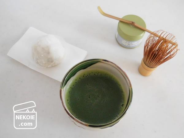 前回、前々回と誤って季節外れの平茶碗を使ってしまいましたが、今回は半筒型のお茶碗で。大福の包み方が甘く、更にちょっと大きすぎた以外は及第点かなと…。