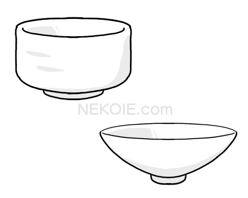 抹茶碗にも色々種類がありますが、形状だけでざっくり分けると、よく使われるのは筒型(半筒型)と平型。筒型というのは文字通り背の低い寸胴タイプのお茶碗で、平型というのはごはん茶碗のように、ひっくり返すと富士山型になるようなお茶碗です。